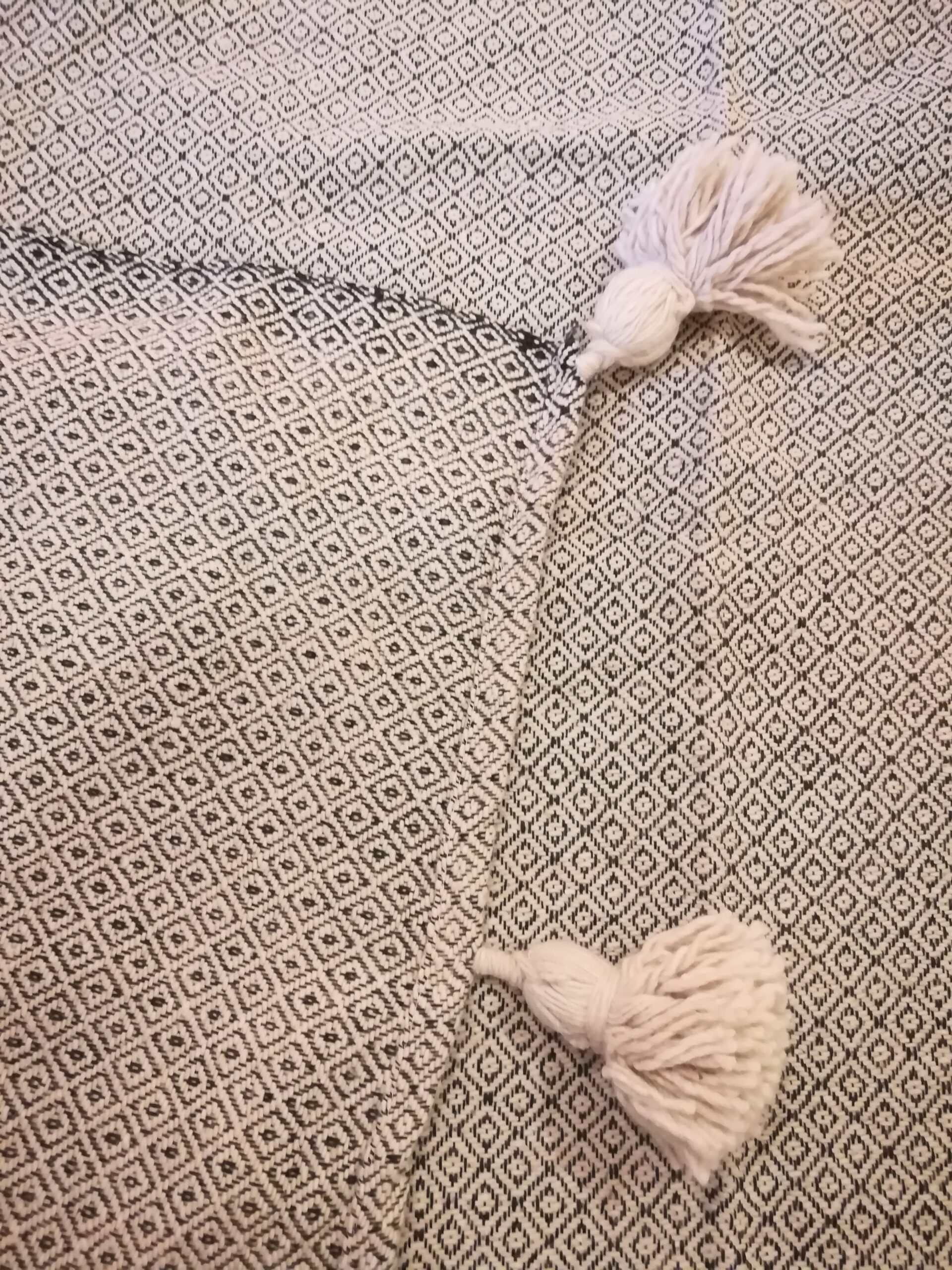 Telo marocchino con disegni a rombi nella parte finale in cotone con pompon bianchi su due lati