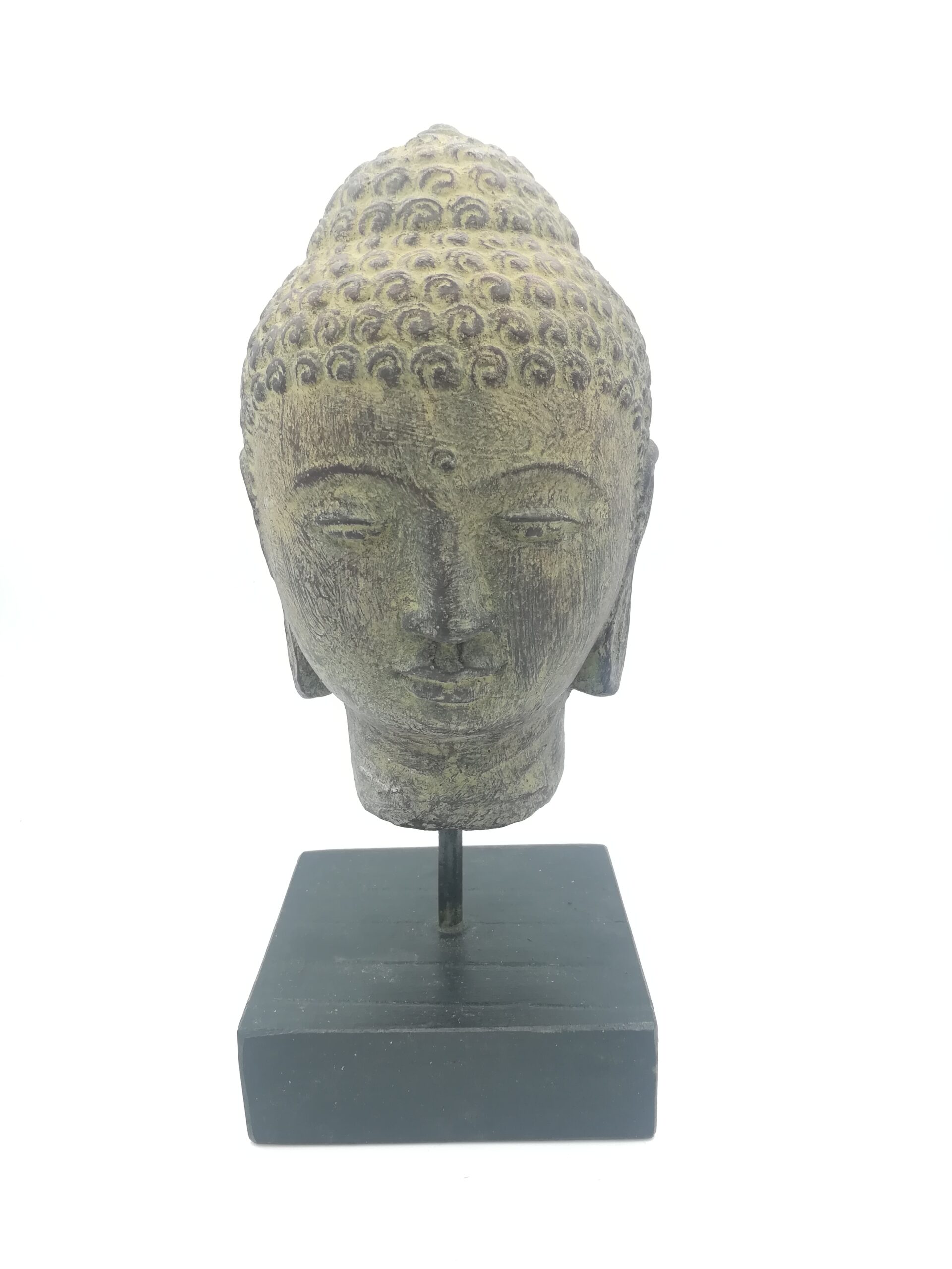 Testa di Buddha realizzate in Indonesia in pietra color naturale su piedistallo in legno dipinto di nero