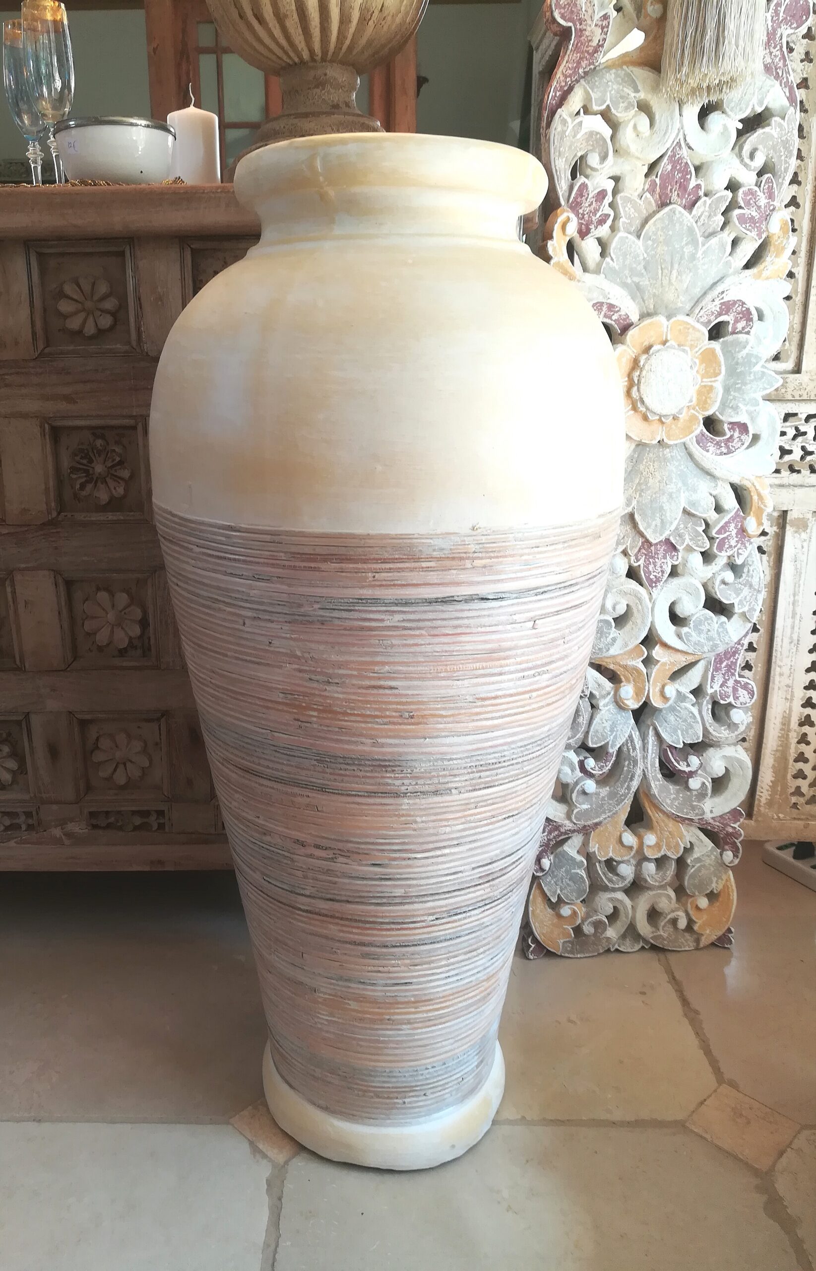 Il vaso alto Asan indonesiano è un’elegante opera artigianale che unisce materiali naturali e design sofisticato.