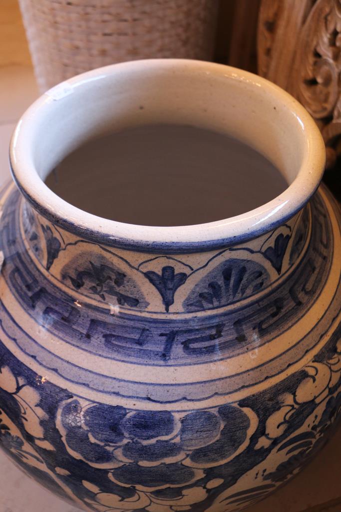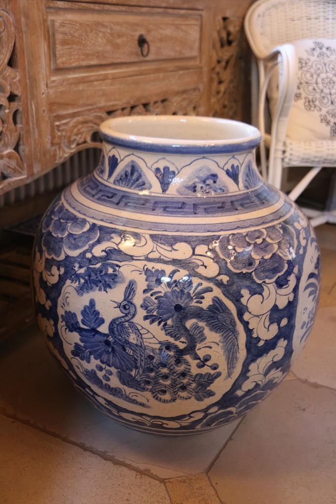 Vaso indonesiano grande antico in ceramica smaltata con decorazioni in stile orientale color bianco e blu raffiguranti fiori ed animali