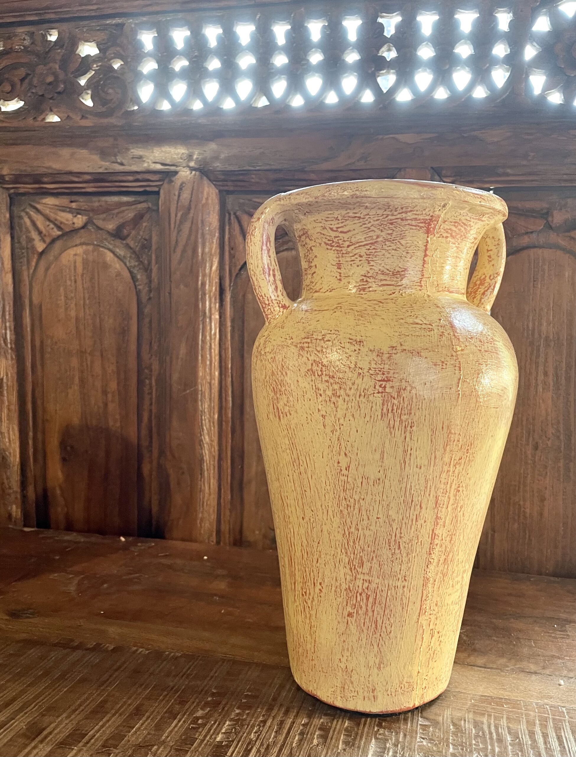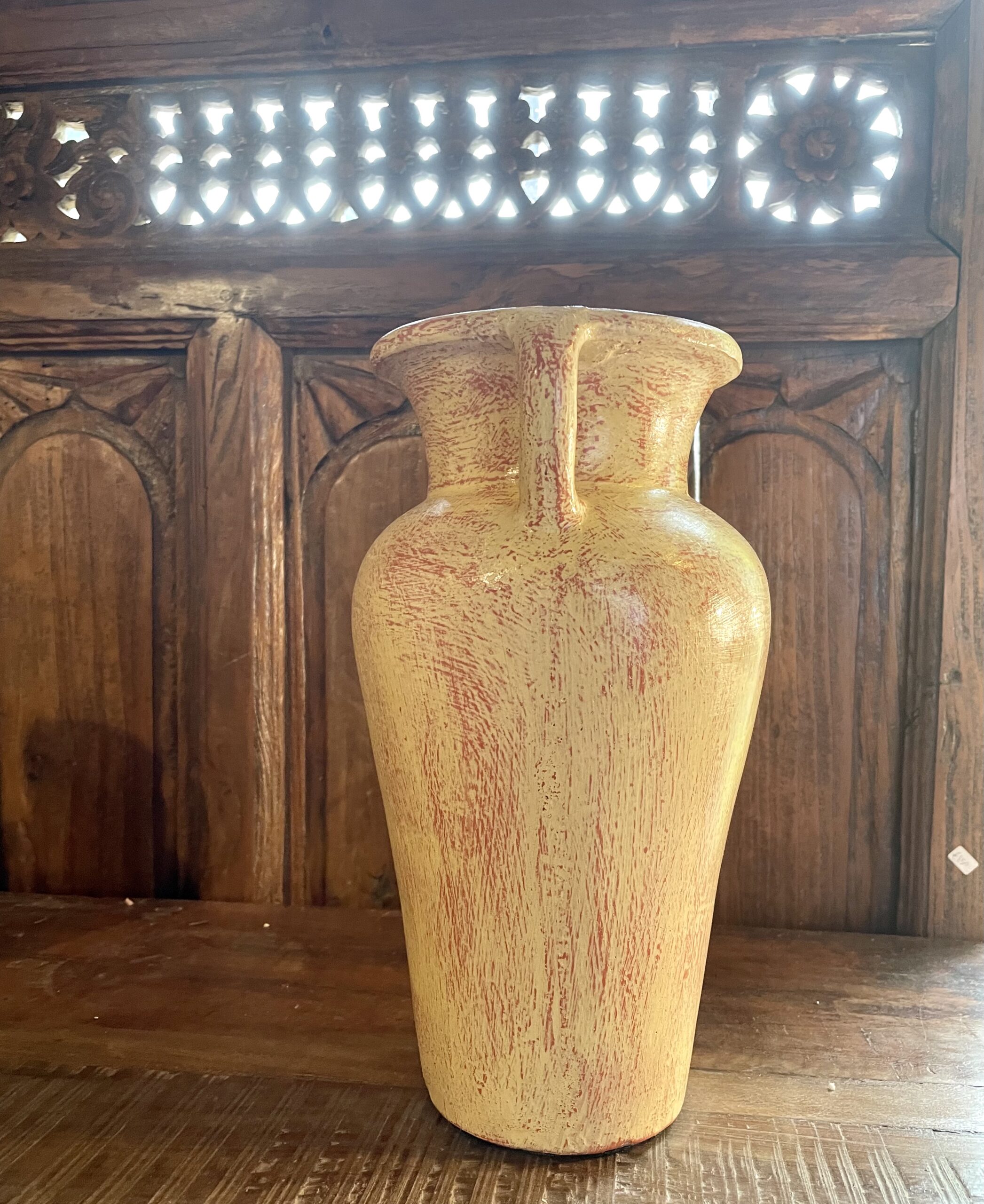 Il colore ocra che riveste la superficie dell’anfora aggiunge calore e profondità al suo aspetto. Questa tonalità terrosa, ricca e avvolgente, conferisce al vaso un aspetto naturale e organico, mentre la terracotta sottostante aggiunge una sensazione di tradizione.