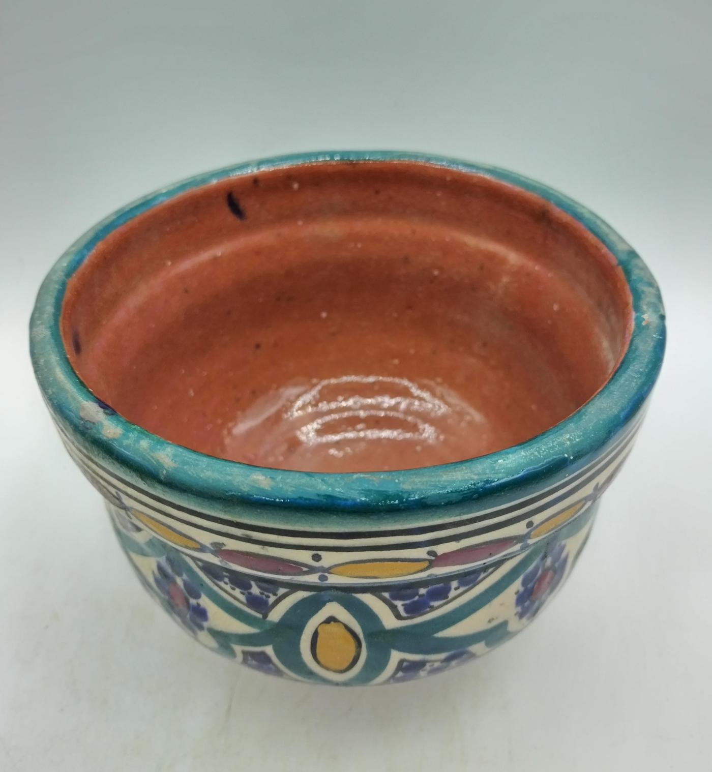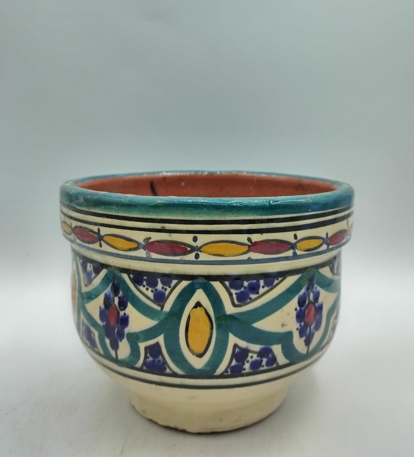 Vasetto in terracotta smaltata con motivi geometrici, realizzato artigianalmente in Marocco