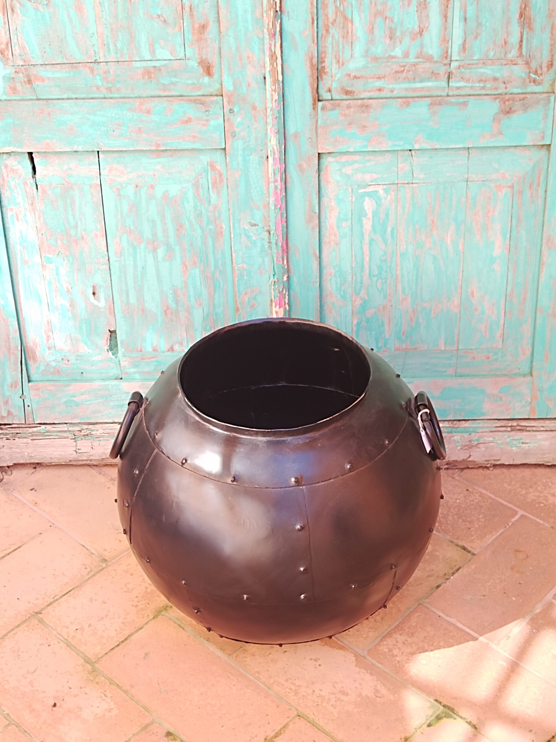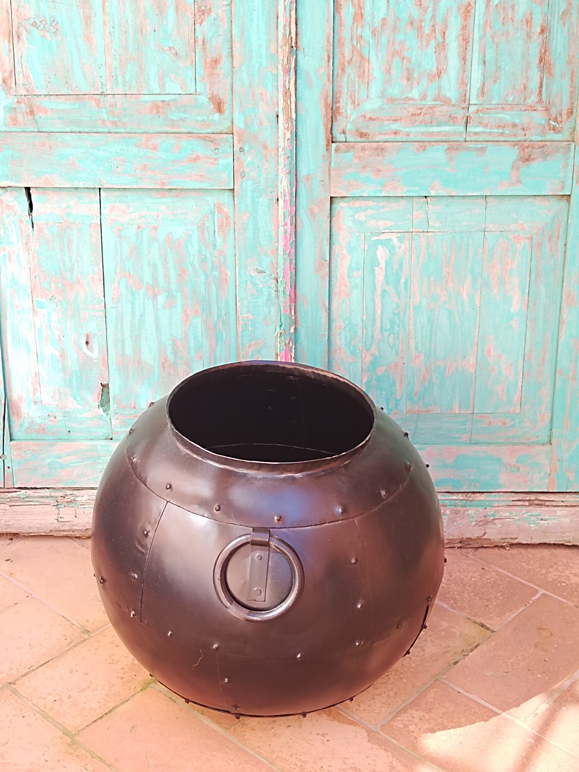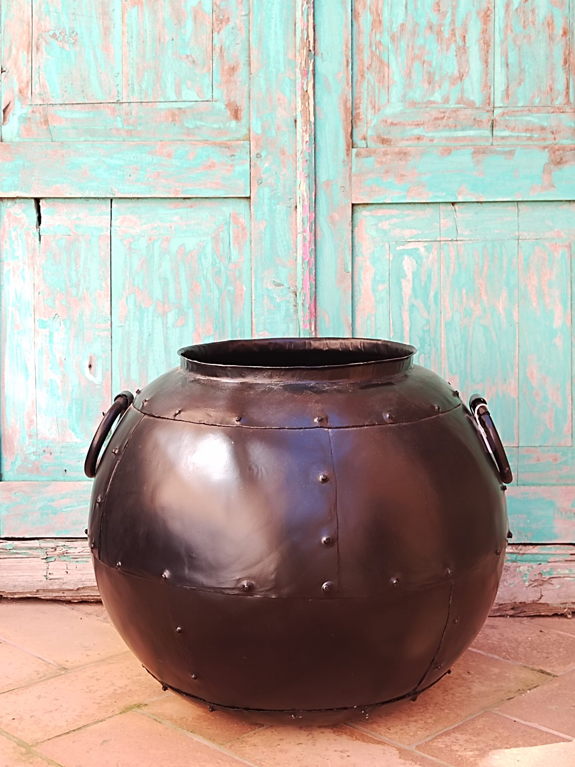Vaso tondo in ferro battuto dipinto di nero, realizzato in India