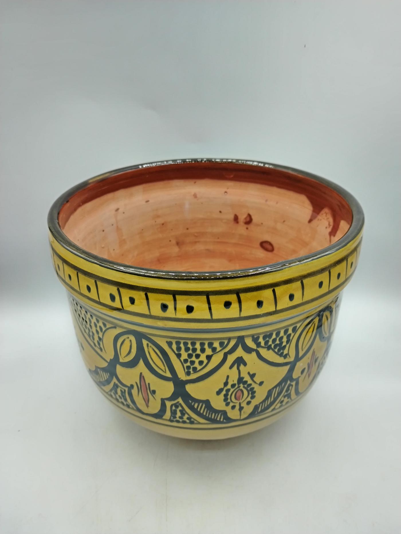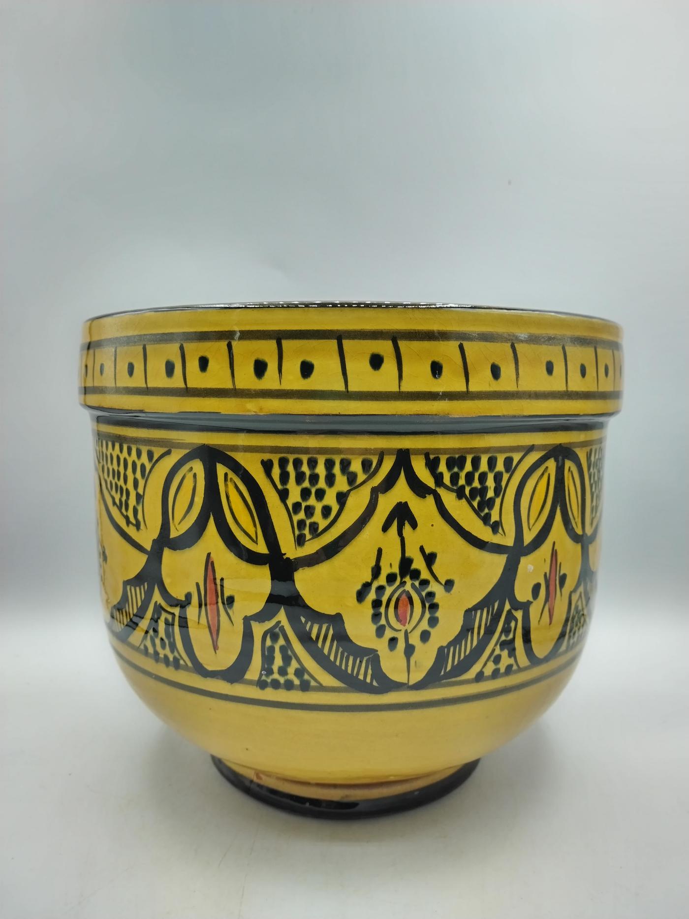 Vaso in terracotta smaltata con motivi geometrici e floreali, realizzato artigianalmente in Marocco