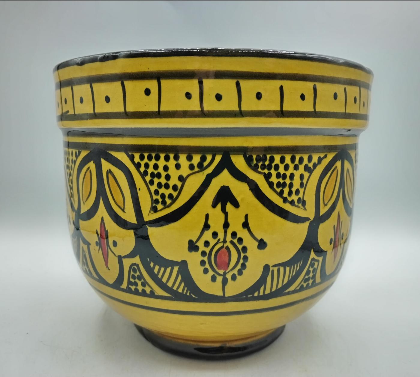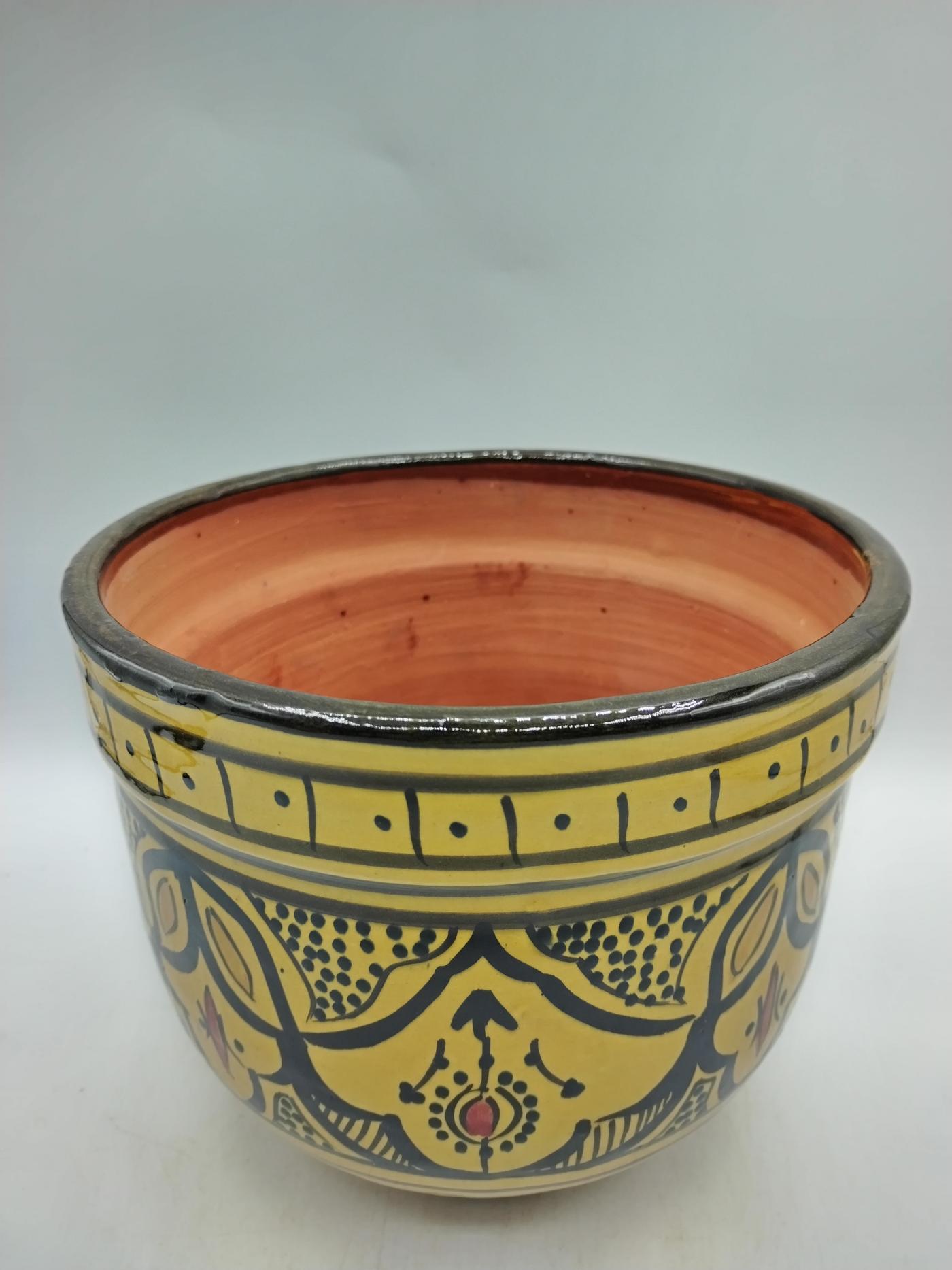 Vaso di misura media in terracotta smaltata con motivi geometrici e floreali, realizzato artigianalmente in Marocco