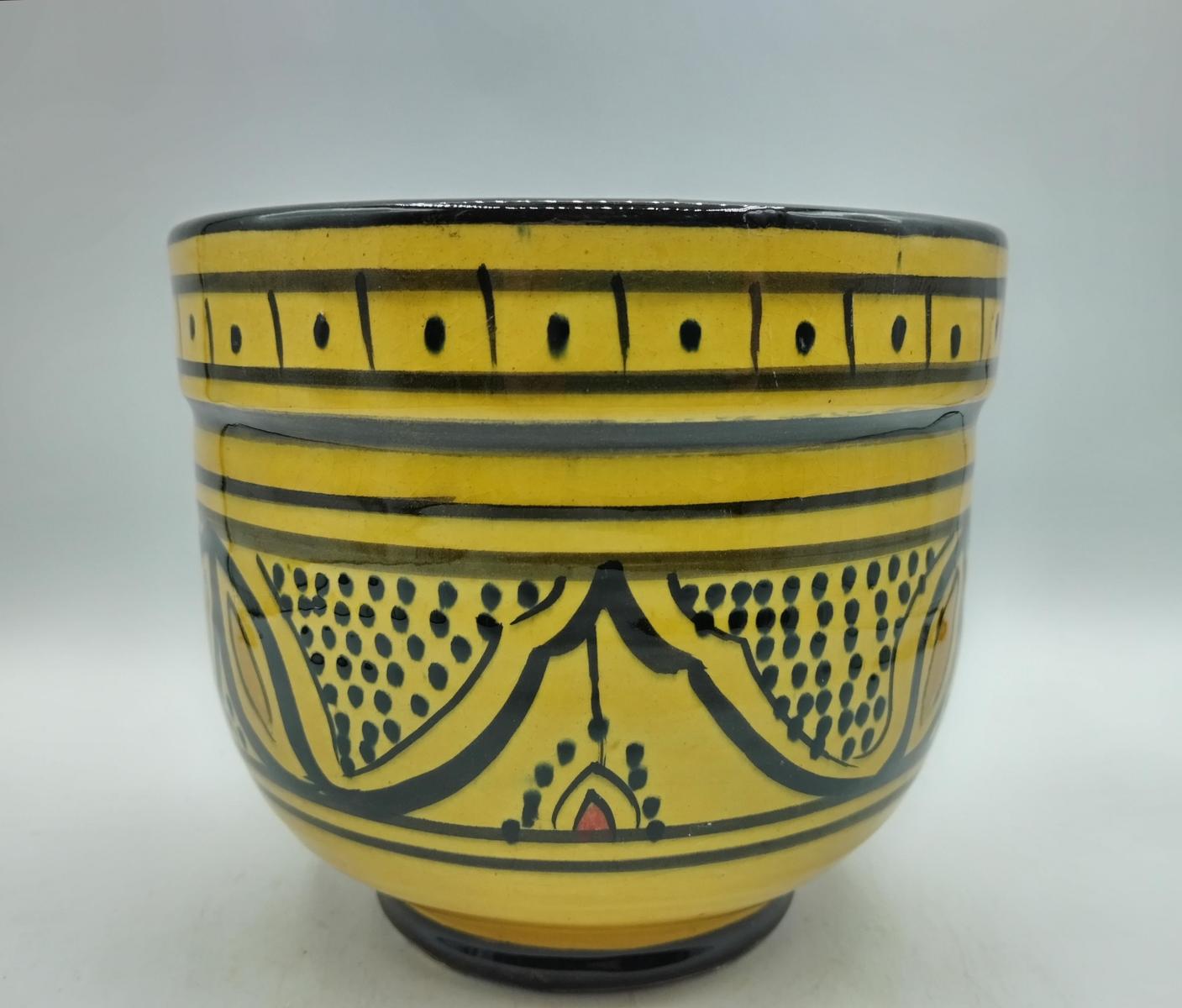 Vaso in terracotta smaltata con motivi geometrici, realizzato artigianalmente in Marocco