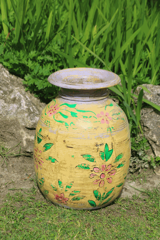 Vaso decorativo in legno realizzato artigianalmente in India, color giallo ,dipinto con motivi floreali