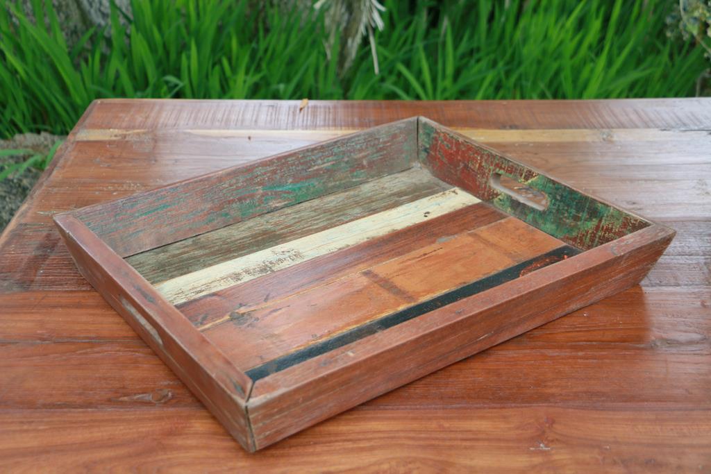 Il vassoio Raj è realizzato in India da artigiani locali, è composto da doghe in legno di teak naturali decapate in vari colori, ha una forma semplice e lineare con due fori laterali comodi per il trasporto.