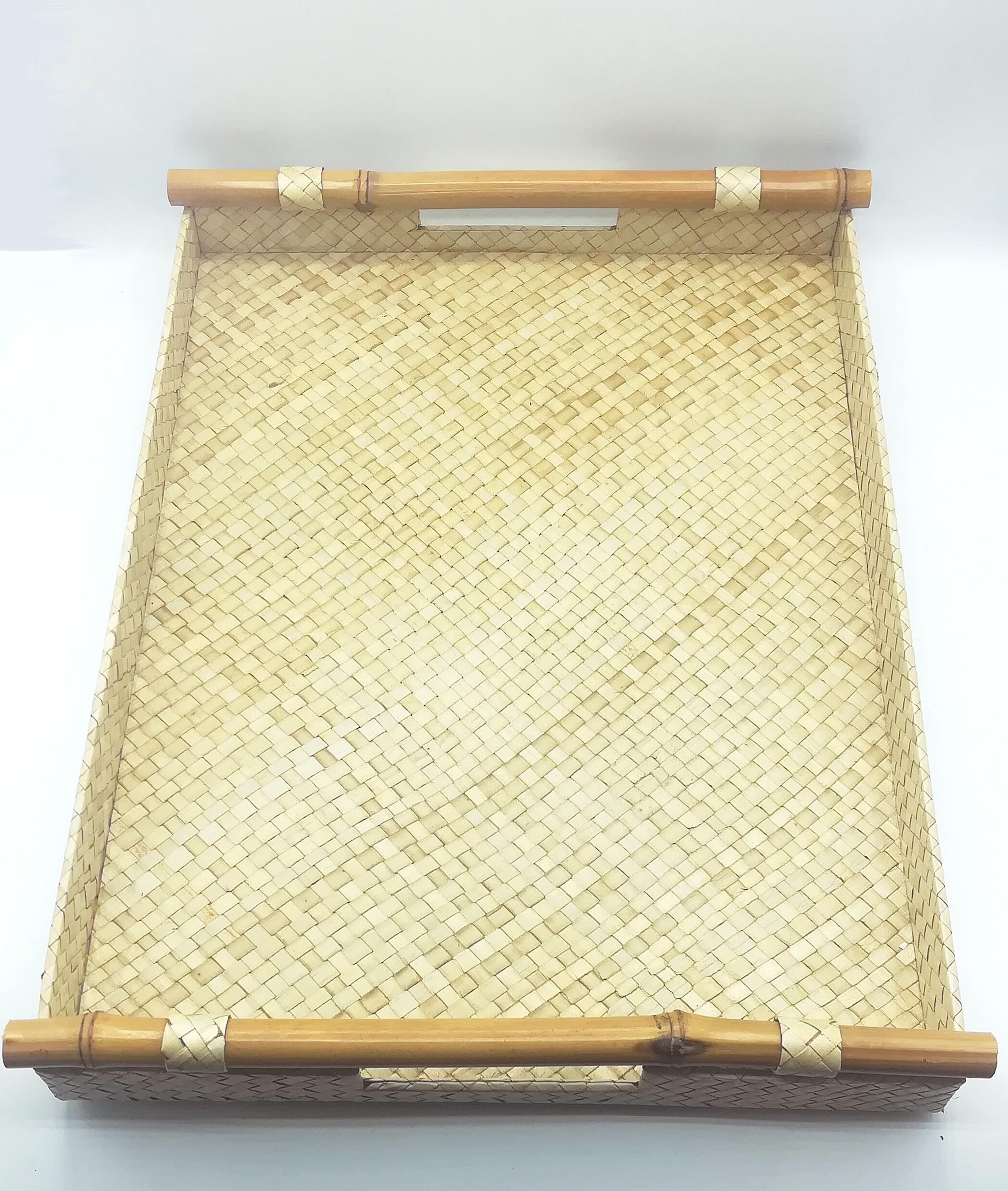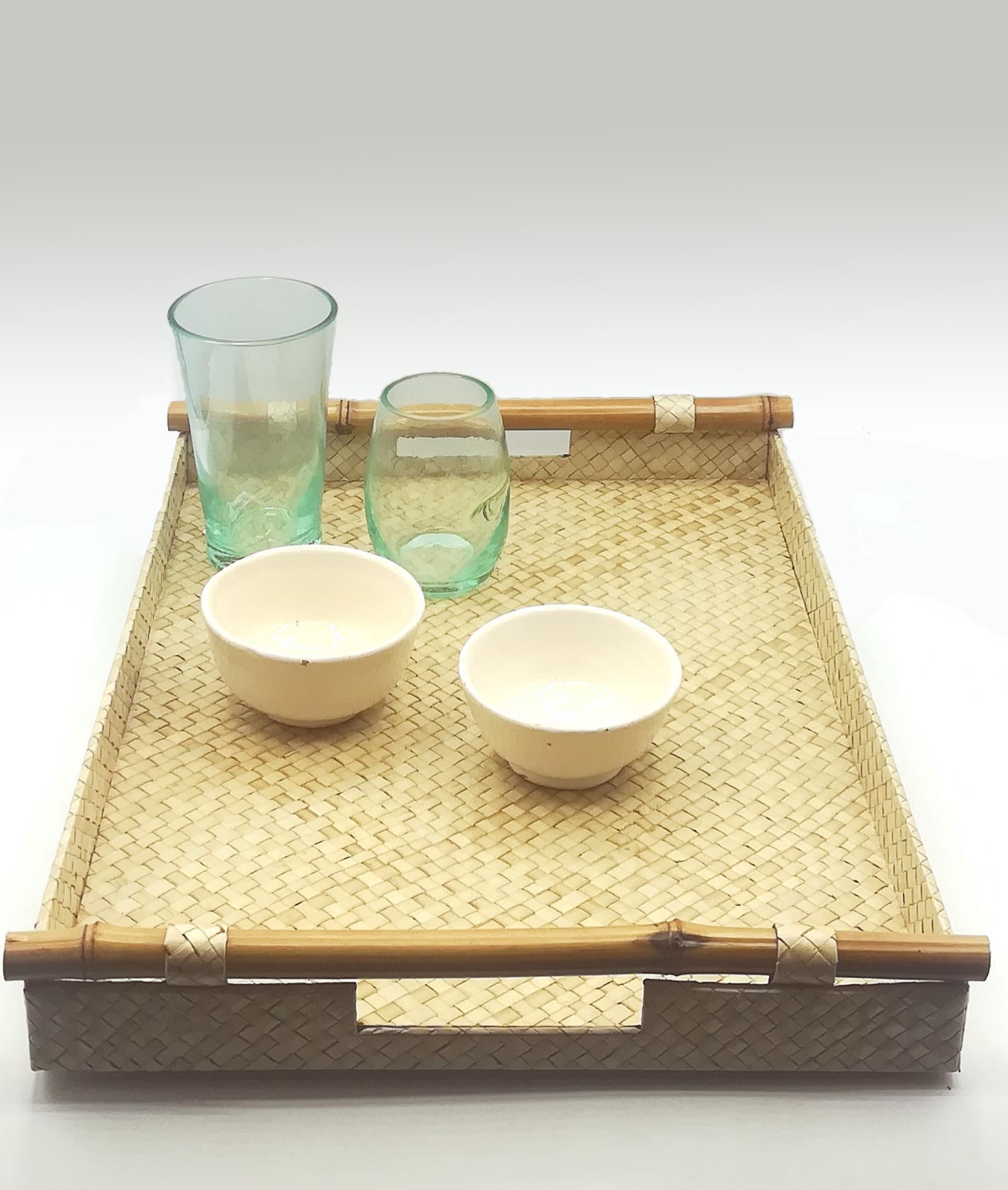 Vassoio rettangolare realizzato in rattan con manici in bambù