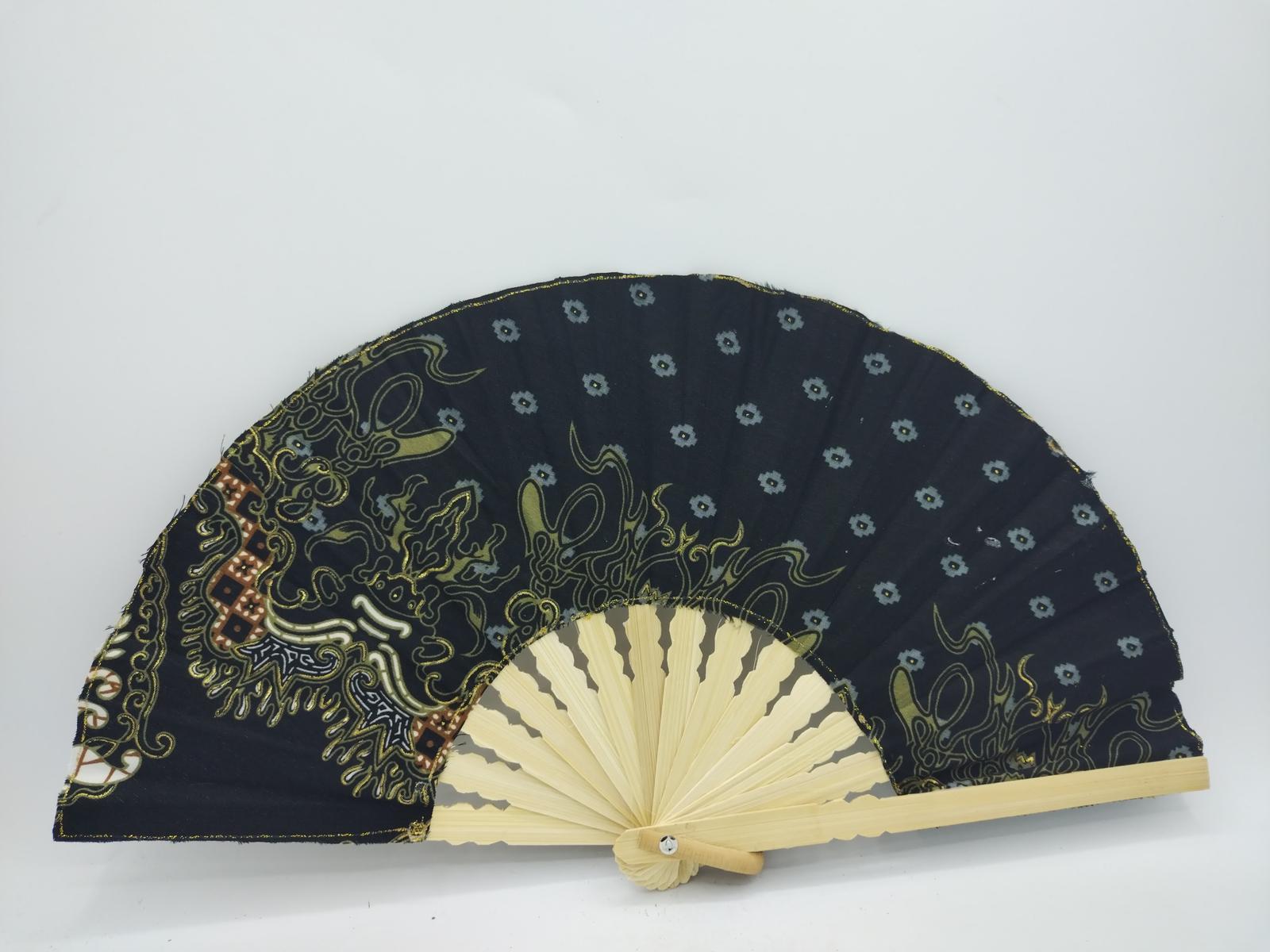 Ventaglio prodotto artigianalmente in Indonesia, realizzato con parti di tessuti Batik con disegni tipicamente orientali
