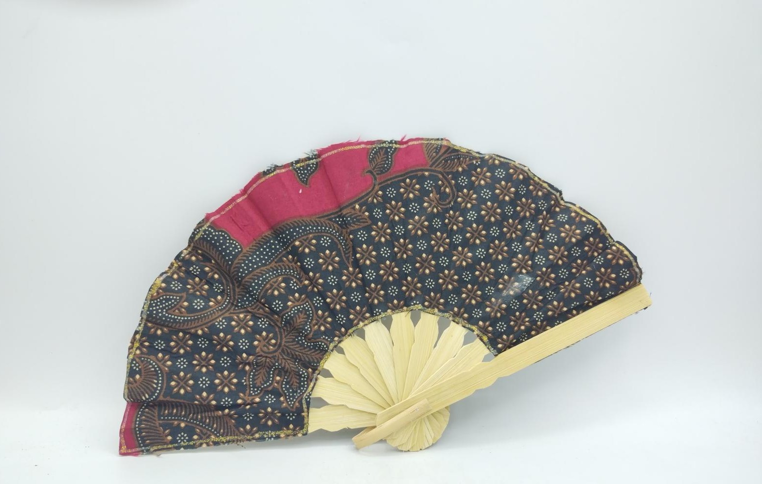 Ventaglio realizzato artigianalmente in Indonesia con parti di tessuti Batik con disegni tipicamente orientali